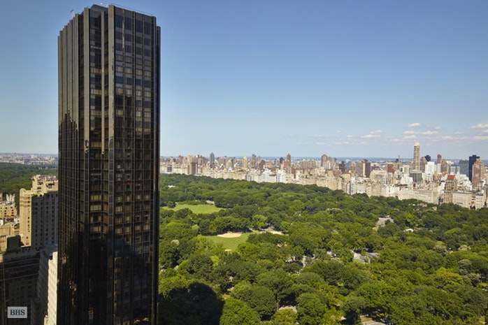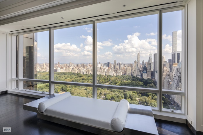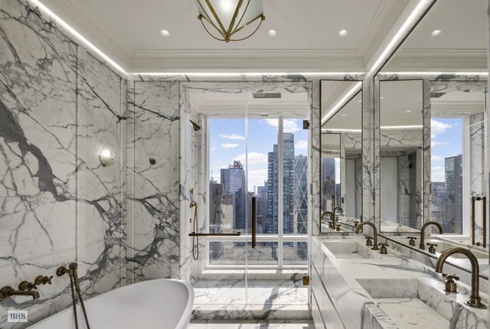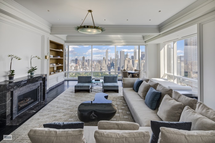 Parisian architect Nathan Litera designed the new space on the buildings 42nd floor, recently listed by Brown Harris Stevens. Held under 10’4” a ceiling, the newly designed apartment features a chef’s kitchen, Black Nero Marquina fireplace, wet bar, and floor-to-ceiling windows overlooking the Central Park South skyline. The home features high-end Gaggenau appliances and Calacatta Oro marble countertops that compliment the lacquered cabinets and furnishings of the rest of the space. The private “wing” of the apartment—which tells you a lot about the level of style here that its broken down into wings—features a huge master bedroom with walk in closets and en-suite marble covered bathroom. That overlooks Columbus Circle. The space also enjoys the amenities of pool and spa from the hotel next door, as well as hotel level amenities like 24-hour room service available from the Jean Georges restaurant nearby. The three bed, four and a half bath post-war apartment steps away from everything the Upper West Side knows best to the north, yet feels more personal and home-like than Midtown’s colder nature. The home also features a library, roof garden, health club, and some of the best neighbors in the city.