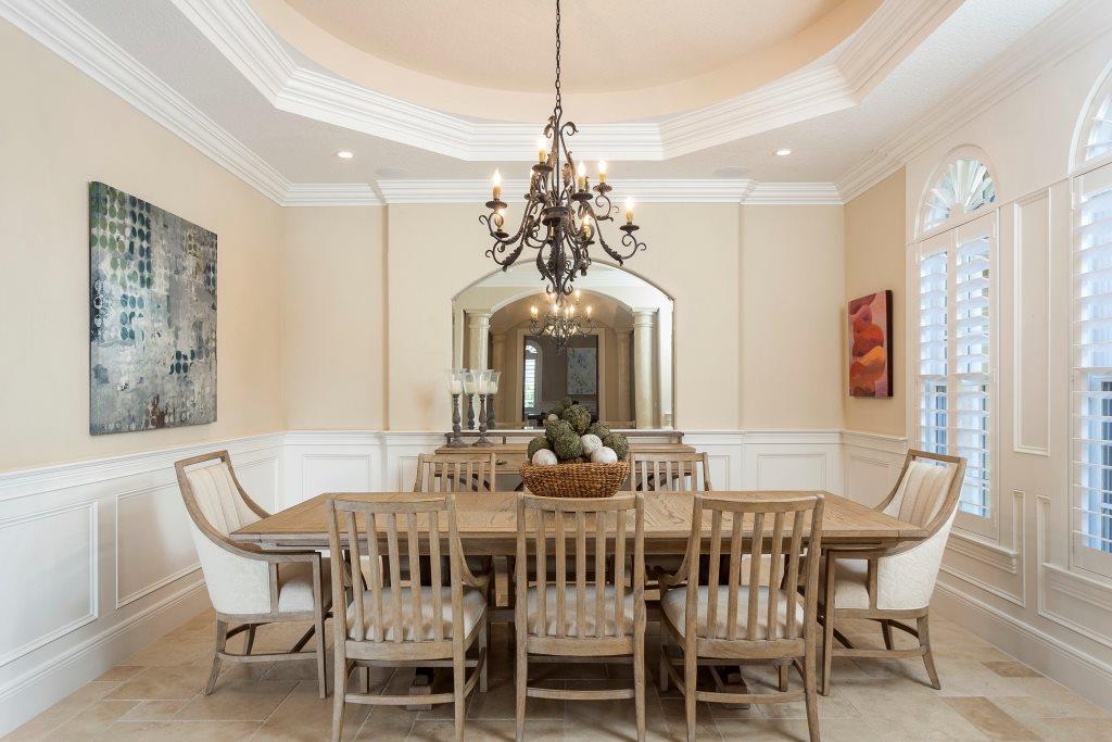 The estate boasts a Mediterranean style with transitional elements and attention to detail, including travertine and hardwood flooring, soaring ceilings, and extensive millwork throughout.