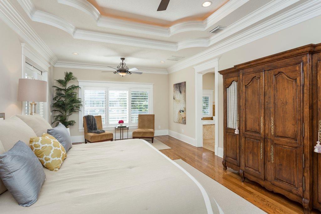 A first floor master retreat includes a sitting area, large walk-in custom closet and elegant bath, and additional three en-suite bedrooms on the second floor.
