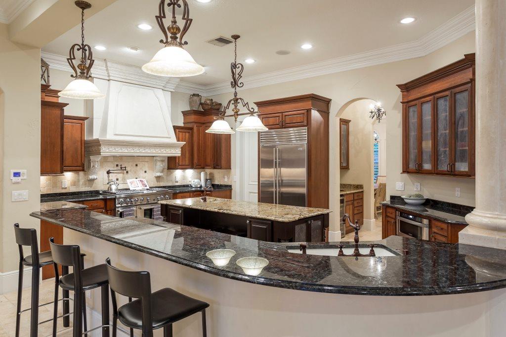 The impressive kitchen features custom cabinetry, top-of-the-line appliances including SubZero and Bosch, gas range, large center island, granite, walk-in-pantry with custom built maple cabinetry, and Butler’s pantry.