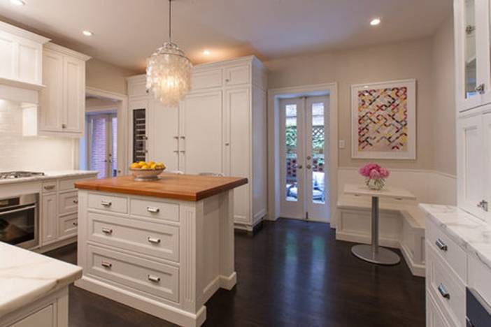 The well-appointed eat-in kitchen—which opens up to a lovely outdoor patio—features custom Grabill Cabinetry, a double oven, sub-zero refrigerator, bar refrigerator, and wine cooler/refrigerator.