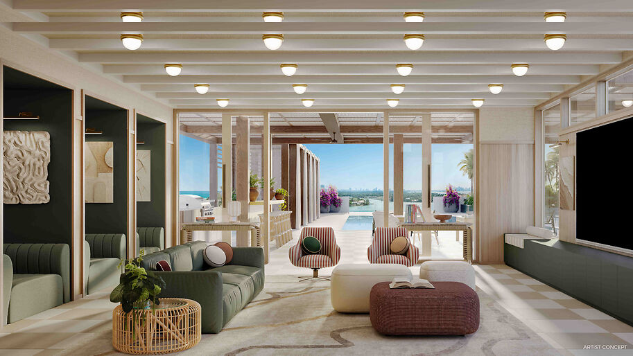 The interiors, designed by Studio Ramirez, will showcase a modern tropical aesthetic consistent with Miami Beach style. Each unit features private balconies, high ceilings, impact-resistant glass doors, European kitchen cabinetry, and high-end appliances. Luxurious amenities for residents include a resort-style pool, a state-of-the-art fitness center, and a media and game lounge, all designed to enhance the beach-living lifestyle.