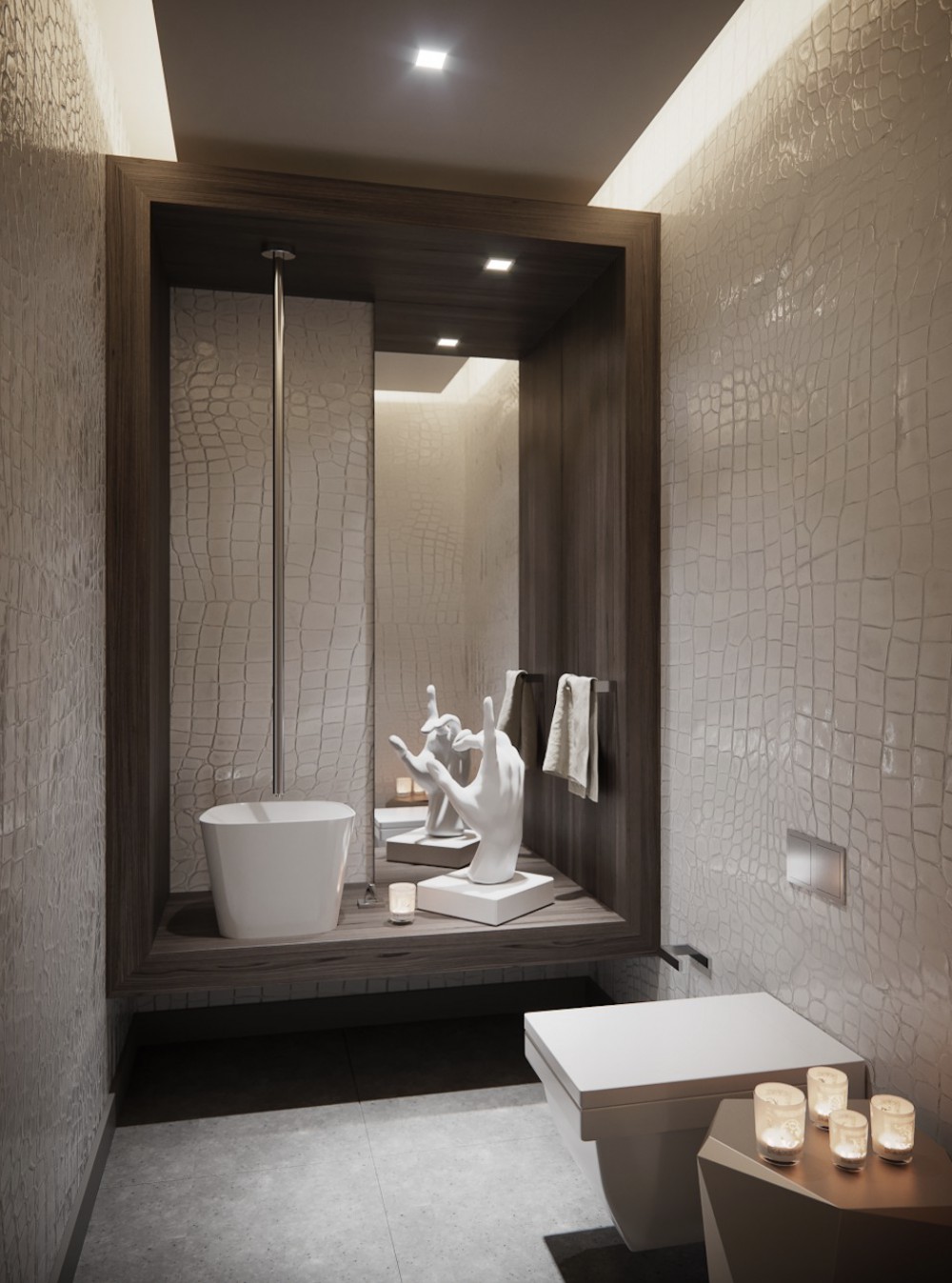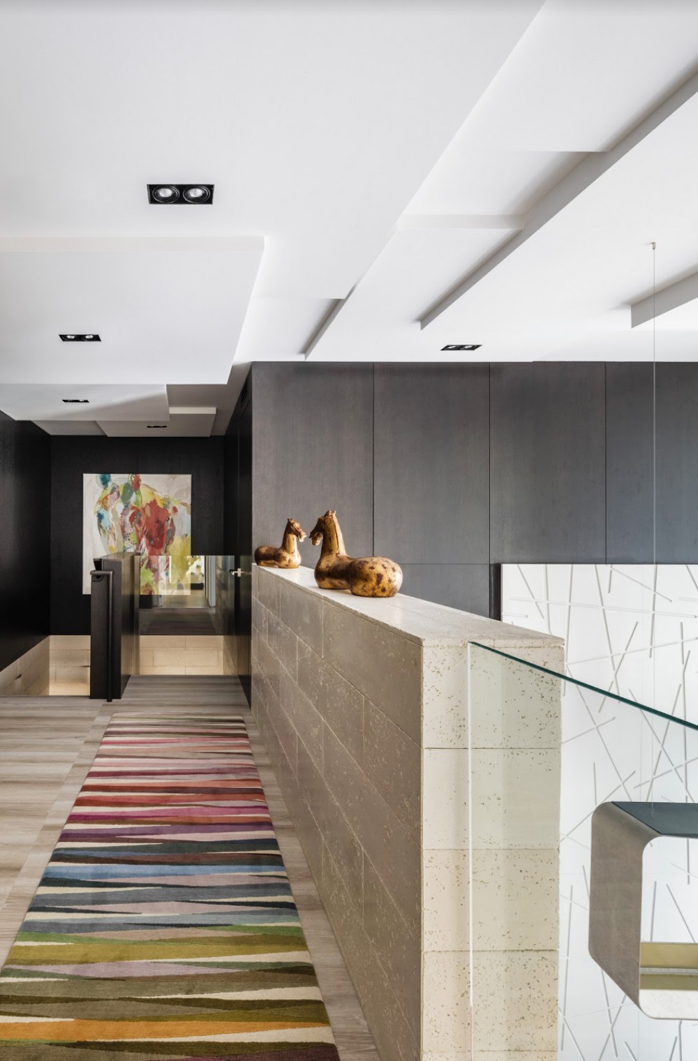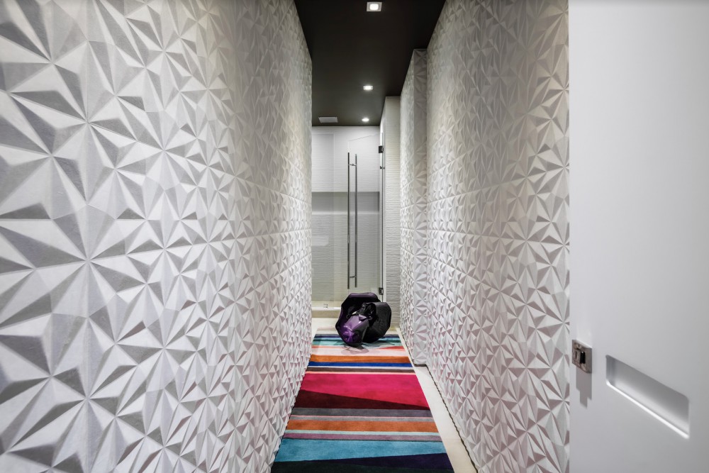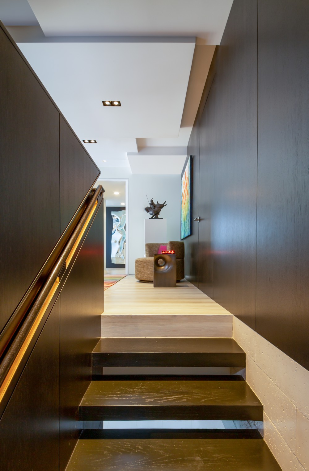 The original layout of the space featured a floating staircase in the middle of the foyer/living area, interrupting the flow of the living space. Ceilings were low due to an outdated AC system. We used the residual areas between bathrooms to encase the new stairway, complete with stone-integrated Ann Sacks sconces, creating a large foyer that organized the circulation on the first floor. The new foyer also serves to display part of the clients’ art collection.