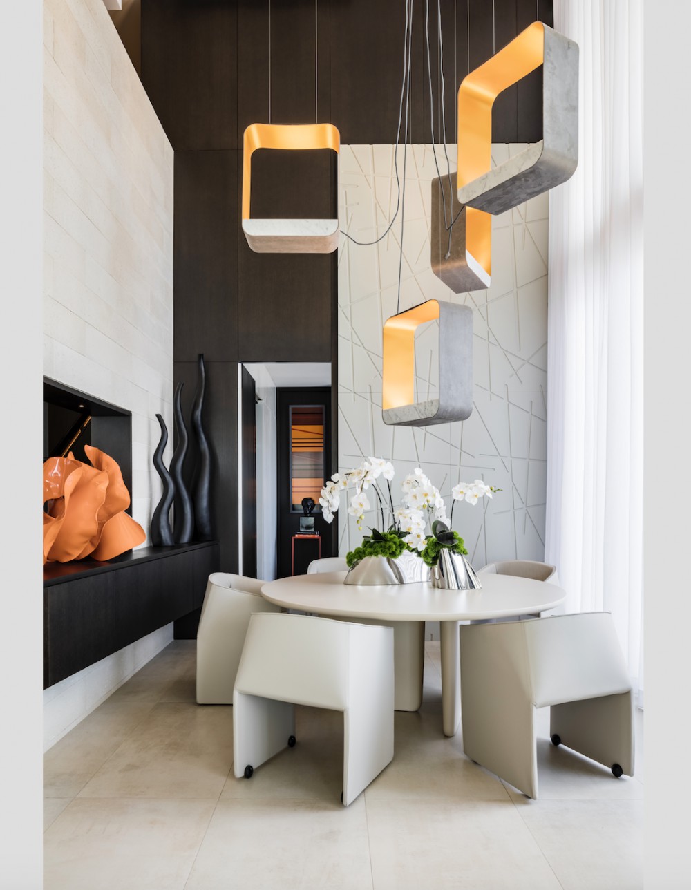 Materials were chosen to lend richness and texture to the space, defining proportions and ratios, with an emphasis on clean, compelling lines to embody a “Modern Eclectic Contemporary” feel. Oversized artwork; furniture from Patricia Urquiola, Poltrona Frau, Luminaire, and Jaider Almeida; a custom-designed Ornare kitchen; rugs from the Rug Company; and a custom geometric lighting fixture in the dining area emphasize proportion in the two-story space, while maximizing the space’s relationship to the double-height view.