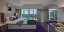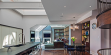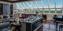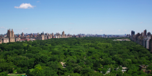 Located at 1 Central Park South, the four bedroom, five-and-a-half bathroom penthouse features a private elevator, gourmet kitchen, 14-seat dining room, plus breathtaking views of New York City. In addition to 229 square feet of exterior space, the unit boasts an angled glass wall that offers unobstructed views of Central Park.
