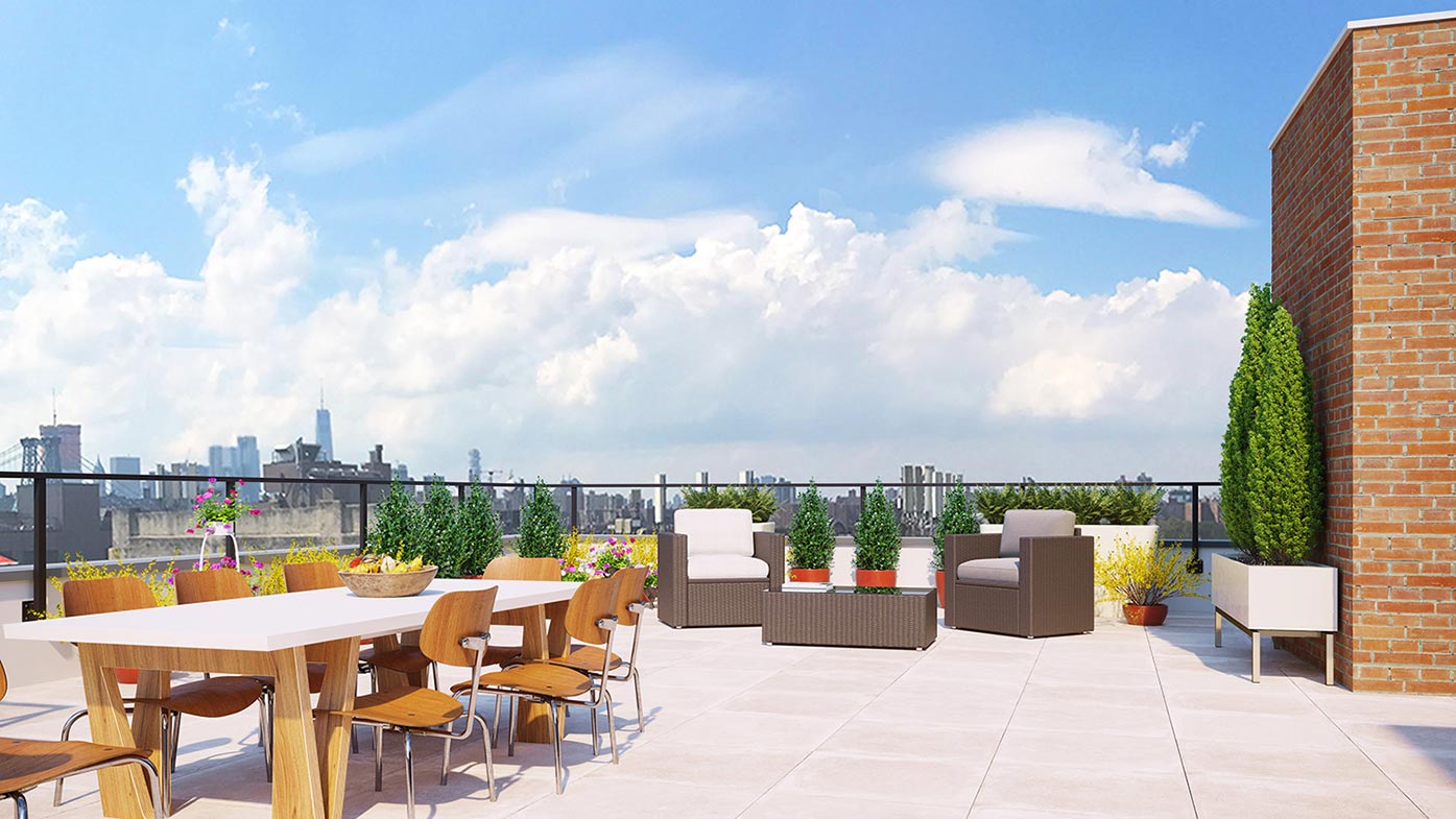 This boutique dual building accommodates 13 family-sized residences that each have either a balcony or an oversized terrace. The most astonishing private outdoor spaces belong to the two penthouses, which flaunt terraces off the living room as well as 1,100sq. ft. roof deck above a solarium.