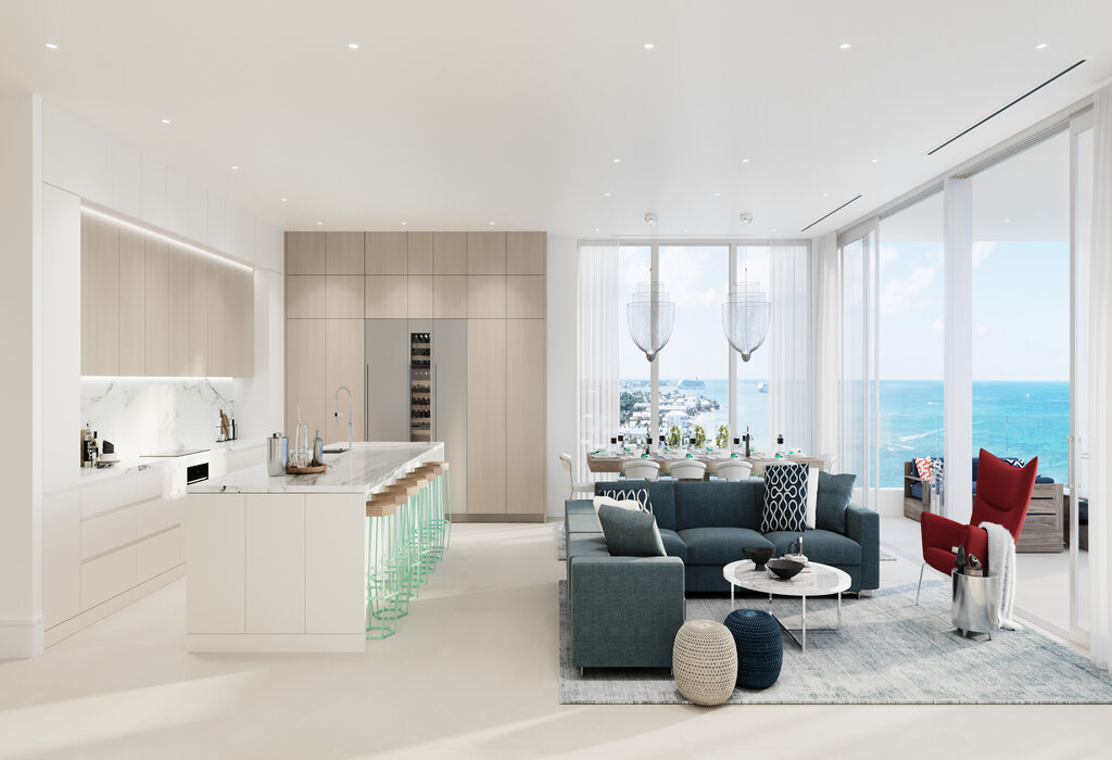 A gracious entryway gives owners an extraordinary sense of arrival every time they step through the front door. Connecting seamlessly to the oceanfront terrace is the main living space, which is perfect for entertaining with its gourmet chef’s kitchen and a spacious dining and lounge area that boasts spectacular ocean views. In the kitchen, Miele and Sub-Zero appliances inspire the joy of cooking and its contemporary cabinetry offers discreet storage.