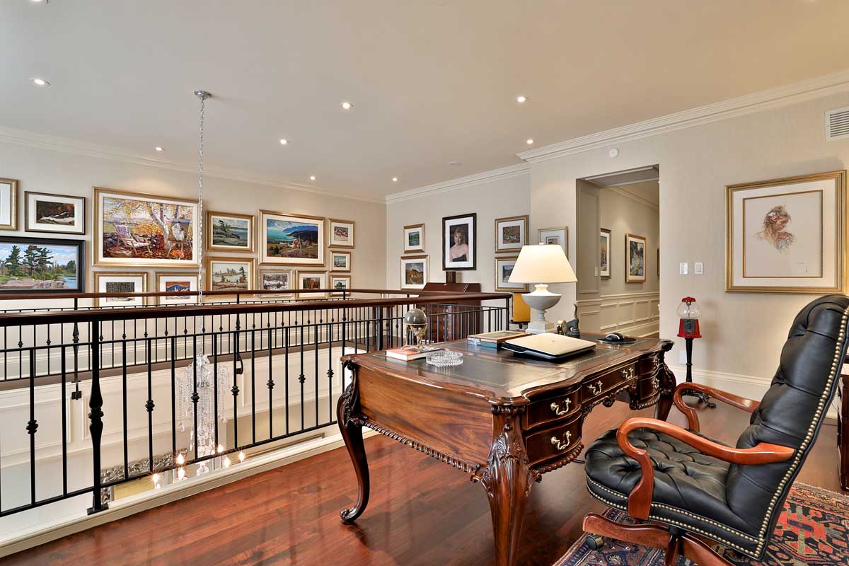 The office opening to the living room below features an impressive gallery for showcasing artwork.