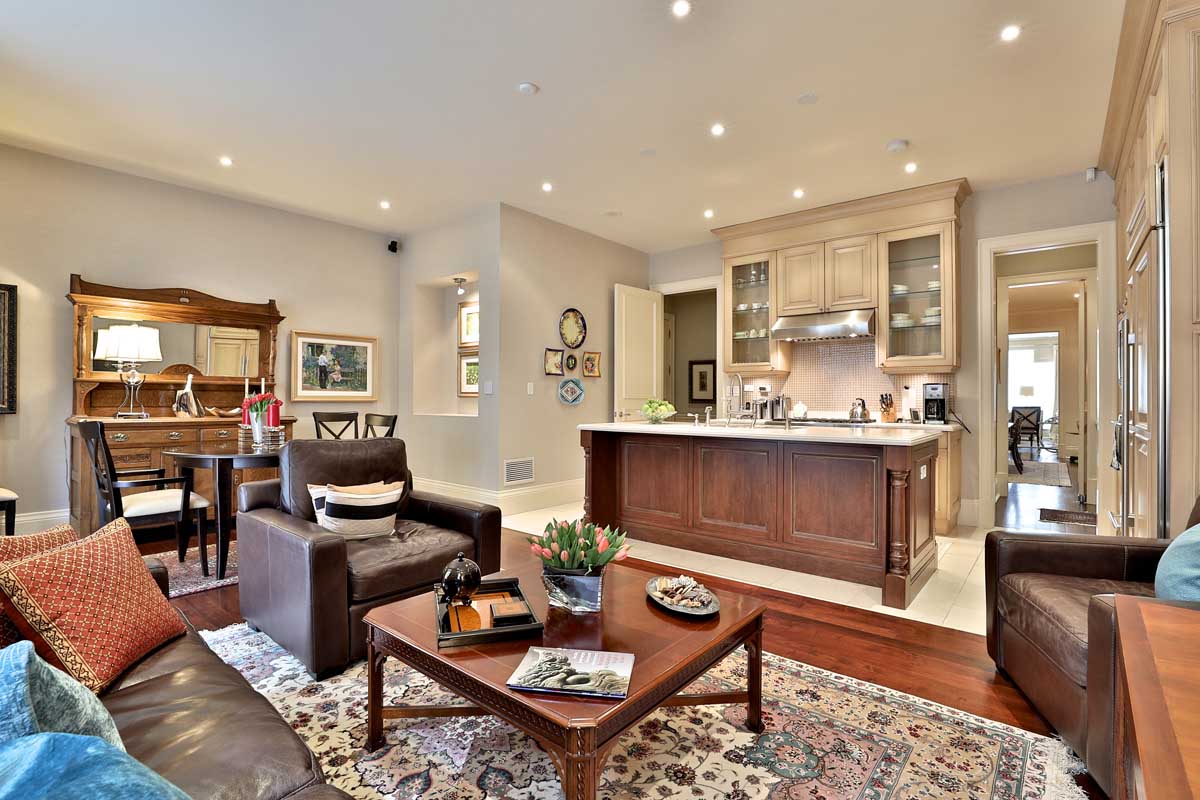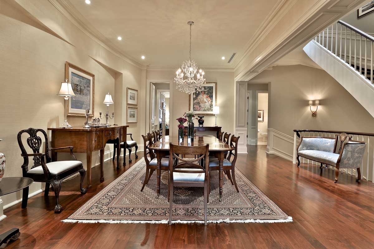 A dramatic two-story living room, enhanced by American walnut four-inch width and three-quarter-inch thick hardwood floor and marble gas fireplace sets the stage for elegant entertaining.