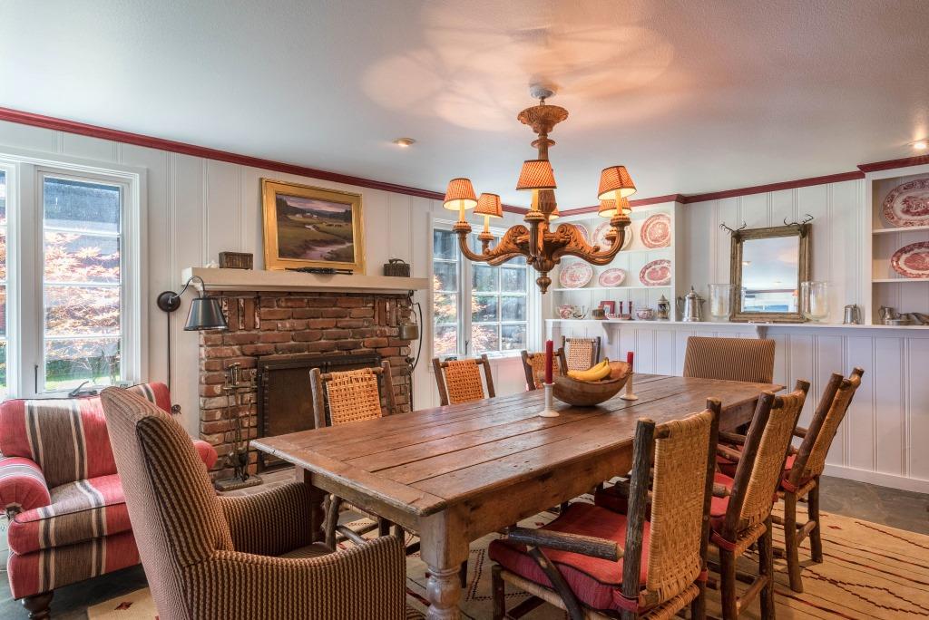 The adjoining updated country kitchen features six‐burner‐and‐bbq double‐oven gas stove and dining room with brick‐enclosed fireplace provides cozy dining in winter months. A powder room and laundry/pantry complete this level.