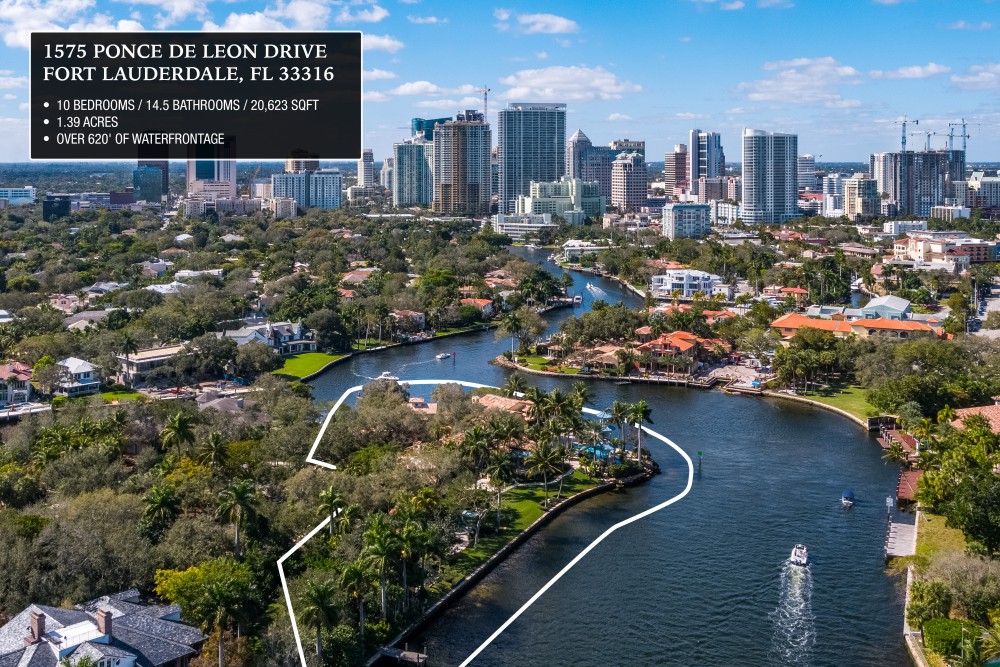 The private Mediterranean-style property situated on 1.41 acres, offering 270-degree river and skyline views, tropical landscaping, and a resort-style pool overlooking the New River with a three-story gazebo with clocktower and curved staircase. The 10-bedroom, five-building compound features cathedral ceilings, custom ironwork and finishes, and floor-to-ceiling windows with river and peninsula water views; a grand foyer with a crystal chandelier; a kitchen with a wood-burning pizza oven and a separate caterer’s kitchen; a French-inspired glass conservatory; a master suite with a lounging area; a guest apartment; and an elevator, gym, workshop, theater, billiards room, staff office, and multiple safe rooms.