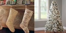 Chandelier Beaded Christmas Stocking ($129) and Faux Flocked Lighted Tree ($799)