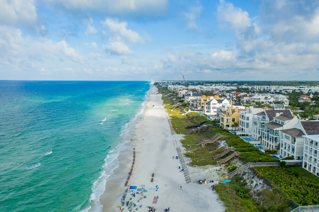 Overlooking one of the most sought-after beaches in the US, the beachfront home sits atop the Bluffs at Sandy Shores spanning 60 feet of primary coastline. Comprising 7,400 square feet of interior living space, the property displays six bedrooms, six full baths, and two half baths. Each room of the home boasts exquisite design, with the highest quality materials and finishes creating an exclusive showcase of coastal design. Throughout all three levels of the home, guests can enjoy iconic coastal living with breathtaking views of the cloud-white sand and the emerald-hued, crystal waters. The impeccable beachfront is located in a low-density gated enclave of residences between Alys Beach and Rosemary Beach, perfect for a relaxing getaway.
