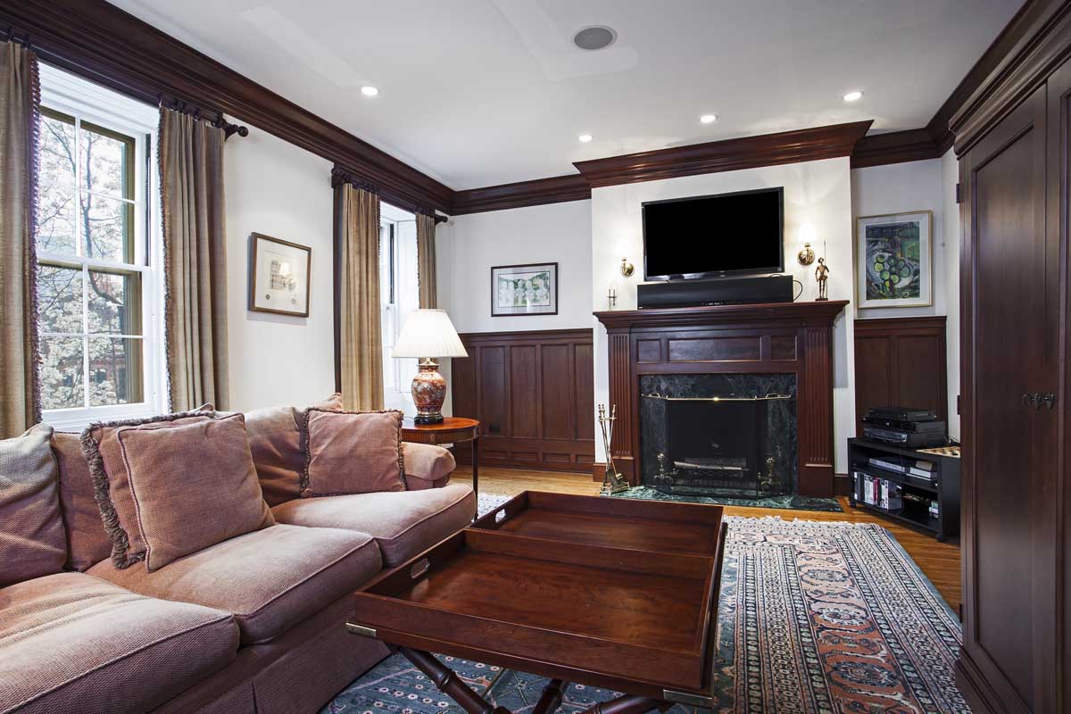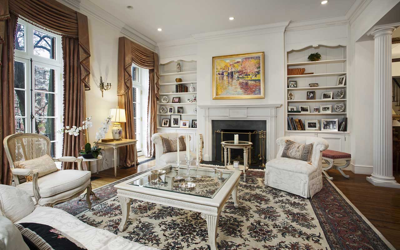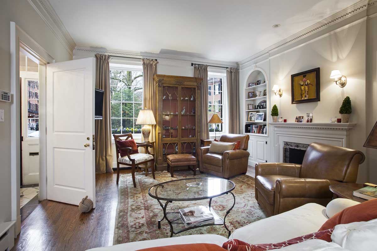 The breathtaking formal living room overlooking Louisburg Square features grand ceiling height, detailed molding, and a fireplace.
