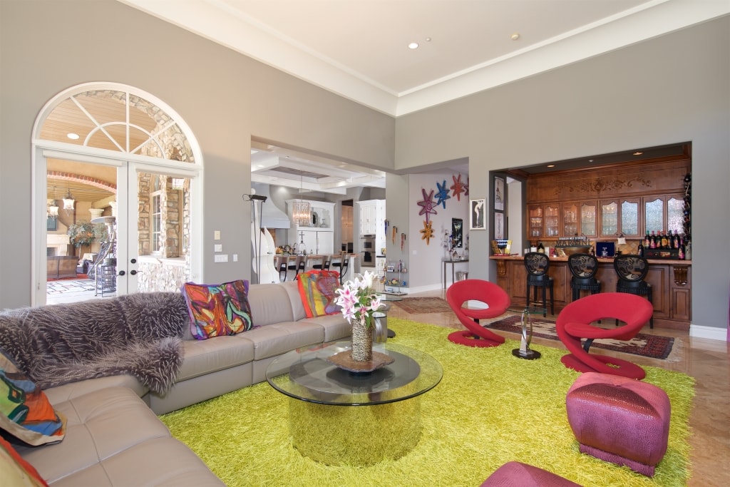 A generous family room has a “feet-up” sensibility with bar and wine cellar. Golf around the world with a state of the art “FULL SWING” golf simulator.