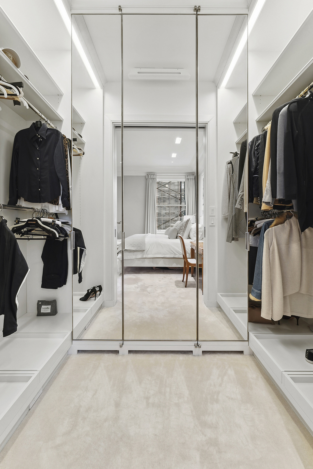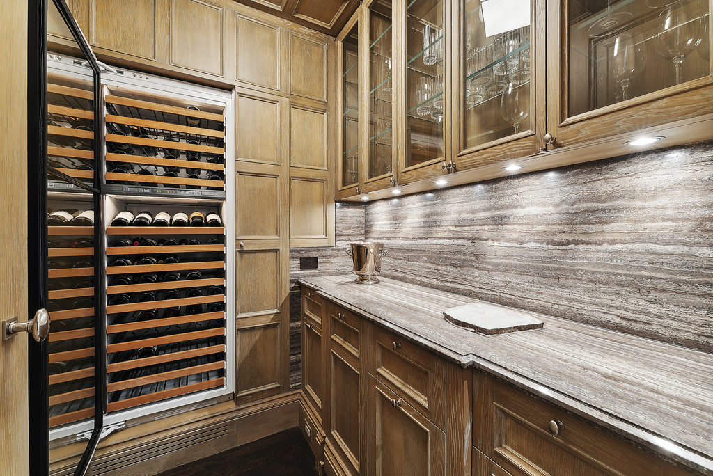 The apartment also boasts a centrally located wet bar with a wine refrigerator for 200 bottles, which is ideal for hosting. Through a hallway, the sleeping quarters offer two bedrooms, with the sumptuous primary bedroom providing a serene retreat with its own en-suite Dolomiti marble bathroom and custom-fitted walk-in closet. The second bedroom has built-in wood paneling and storage space, and there is a second handsome bathroom featuring marble and onyx details.