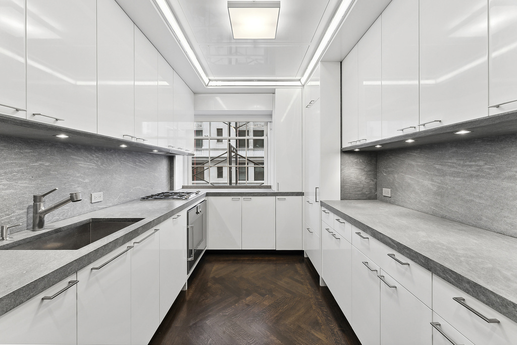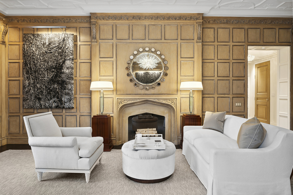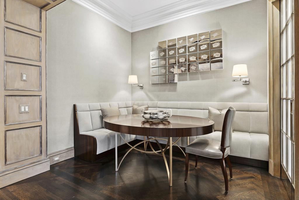 Built in 1916 by esteemed architect J. E. R. Carpenter, 630 Park Avenue, on the corner of 66th Street, is an exclusive Park Avenue address. Designed by AD100 designer David Kleinberg, this meticulously renovated 2-bedroom residence exudes elegance and sophistication, with no expense spared in its renovation. Upon entering, a dramatic gallery with 10’8″ coved ceilings leads you into a grand living room boasting painstakingly restored oak paneling finished with hand-applied silver leaf along with a stunning carved plaster ceiling. The living room offers double exposure, facing onto Park Avenue and E.66th St, and provides a luxurious space for both relaxation and entertainment. Beautiful views North and East over Park Avenue towards the iconic Armory and leafy treetop vistas enhance the beauty of this room. The apartment’s opulent yet understated aesthetic is supported by modern systems and luxuries, such as central air conditioning, heated bathroom floors, a Sonos system, and museum-quality lighting. Nearby, there is an intimate dining area with built-in banquette seating. The kitchen is adjacent to the dining area and features Pietra Cardosa stone countertops and white lacquered cabinetry, along with nickel and frosted glass sliding doors that can close off space while entertaining.