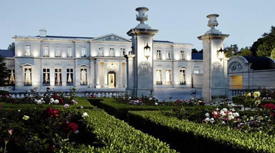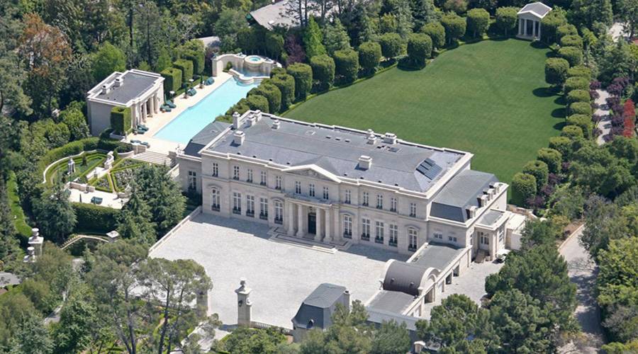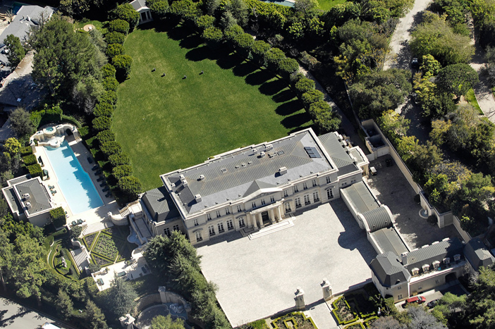 The custom property boasts a 35,000-square-foot residence that was inspired by the 17th century Chateau Vaux-le-Vicomte, according to The Real Estalker, and it offers 12 bedrooms, 15 bathrooms, a dramatic motor court, garages, gigantic formal living and dining rooms, separate staff quarters, a ballroom for 300+ people, a two-story library, a multi-level wine cellar/tasting room, formal gardens, fitness facilities and a truly massive pool.