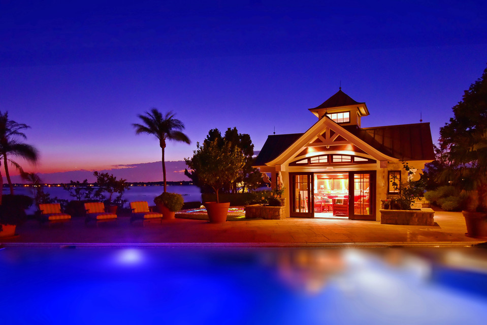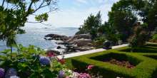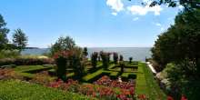 The crown jewel of the sprawling listing is the Rogers Island, an eight-acre island of bedrock that features a picturesque shoreline, towering trees, formal gardens, and rolling lawns. At the top of the island’s highest point, overlooking nearly a mile of coastline, sits a historic and newly restored manor house. The13,000-square-foot, 10-bedroom estate is complemented by a state-of-the-art pool complex, tennis courts, a Nicklaus-designed golf hole, guest houses, and a commercial-scale greenhouse. The island estate also offers a private cove with two granite piers along with floating docks that can accommodate larger yachts.