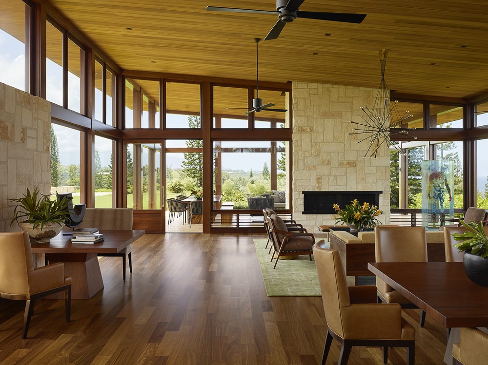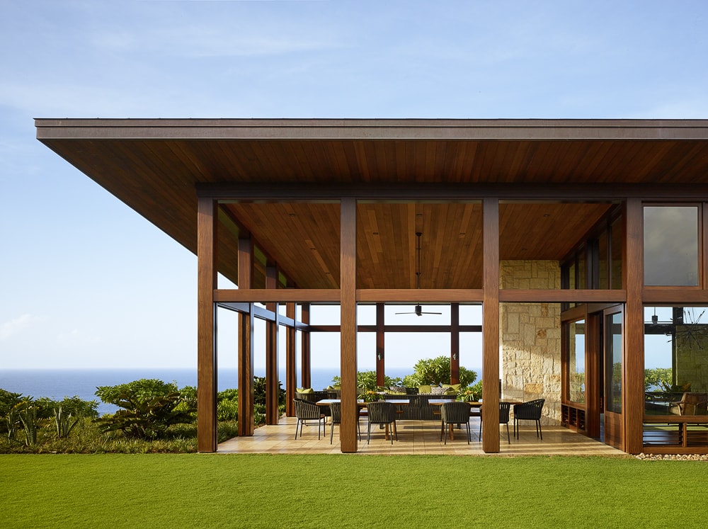 The open floor plan pavilion features a massive kitchen, with extensive indoor and covered outdoor dining and lounging areas.