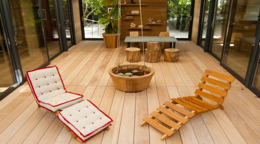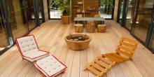 Louis Vuitton delivered this weekend with a modern, U-shaped beach bungalow entitled “House by the Shore.” Assembled in Italy and shipped to Florida exclusively for Design Miami, this gorgeous display boasts fluidity between indoor and outdoor spaces and raw iroko and okoume wood floors and furnishings.