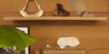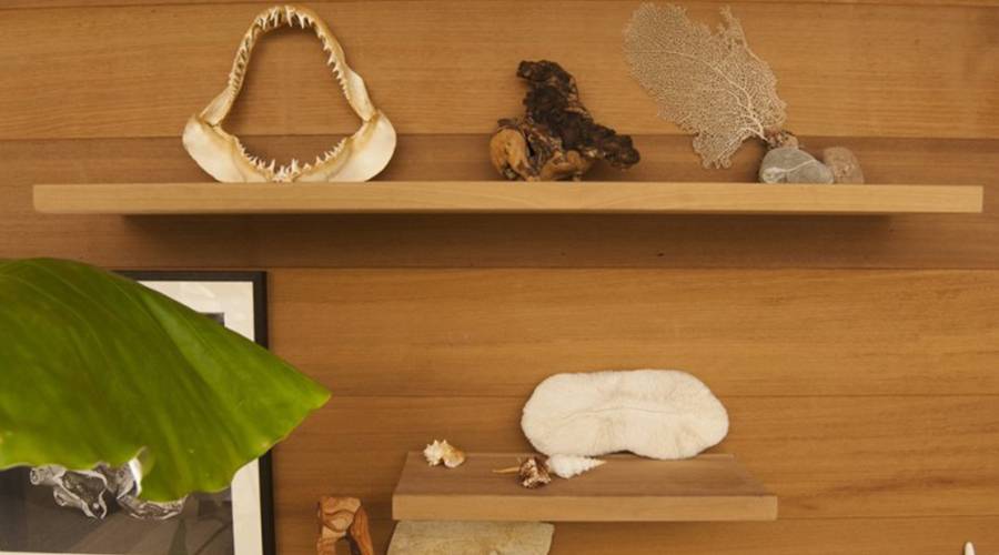 The minimalist living space is intended to be a temporary shelter for beach dwellers, showcasing found objects as décor and what seems to be a simple tin roof. It also offers some leather furnishings, plain vintage pieces and a hide statement rug.