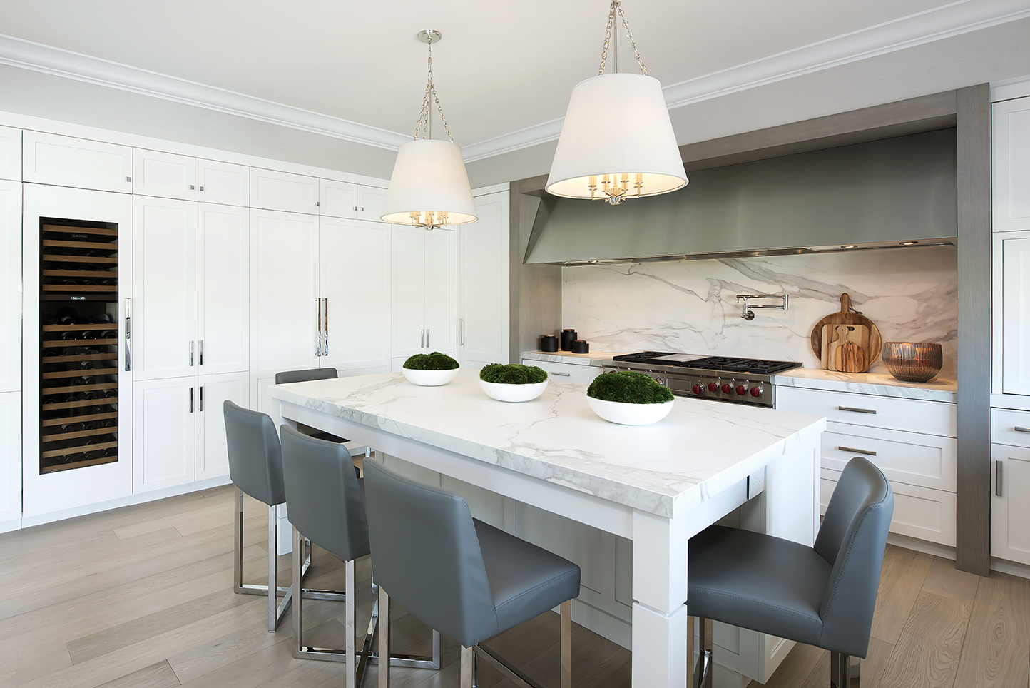 This clean lined kitchen reads both serene- evoking comfort and easy living, and sophisticated- elegant and luxurious.