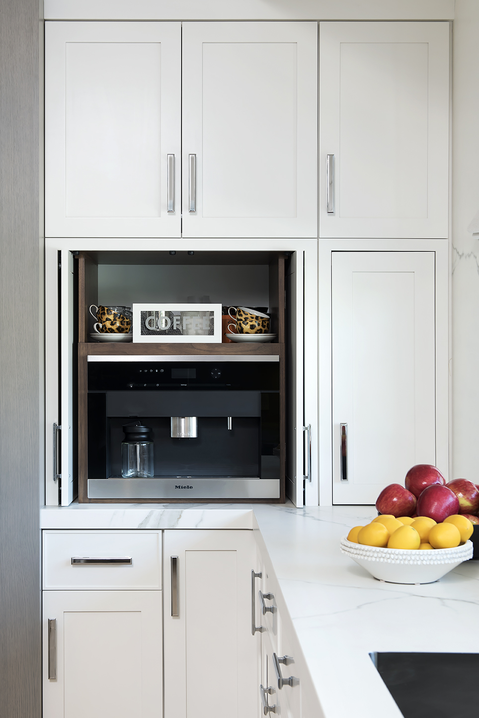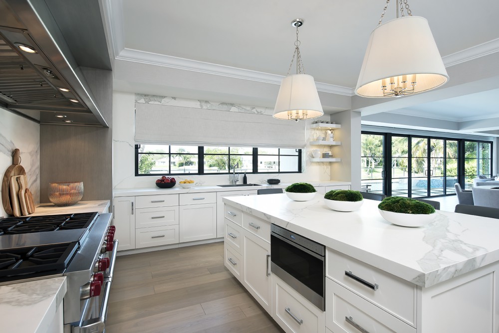 Oftentimes, the reason for opting to do a white kitchen is because of its timeless charm. They are classic and provide a neutral backdrop allowing surrounding elements to pop. In South Florida, a white kitchen is complimentary to our bright and airy climate and coastal influence. This white kitchen certainly compliments its waterside setting while subtly infusing interesting accents and design features. It balances the subtlety of thoughtfully edited elements with striking details to create a cohesive tailored design.