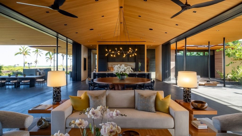 Hale Kai Apo — Home of the Changing Tides — is a front-row estate curated by Averylily and designed by Shay Zak, where iconic Hawaiian architecture meets sweeping coastline and fairway views. Spanning 8,958 square feet under roof, this six-bedroom, five-and-a-half-bath residence features a private office and a seamless indoor-outdoor great room designed for effortless island living.