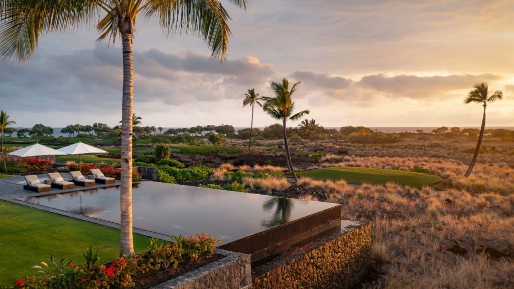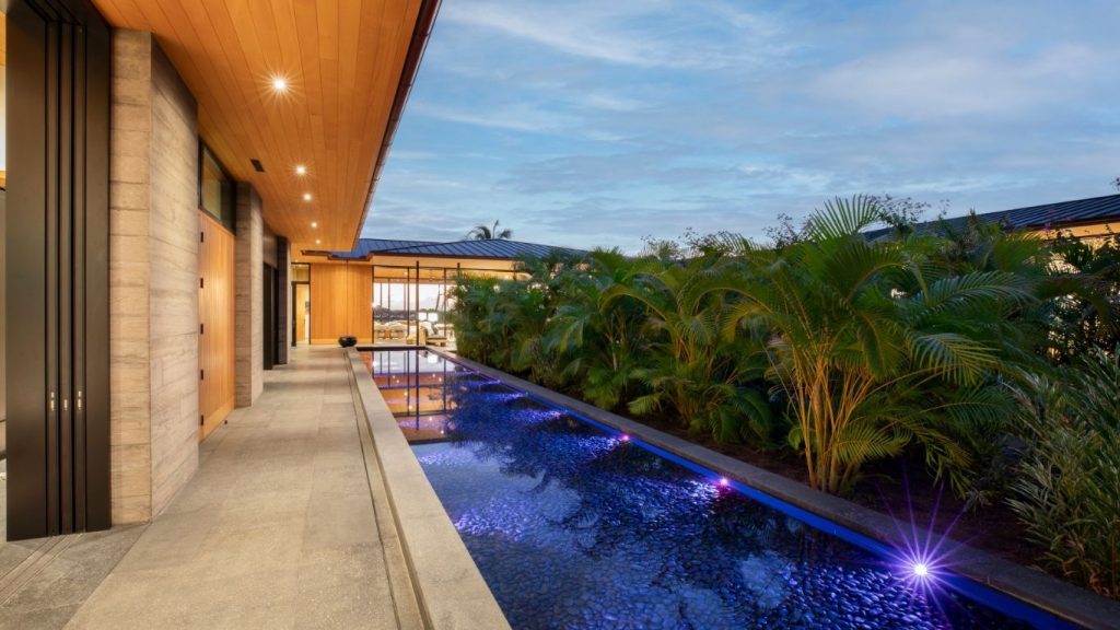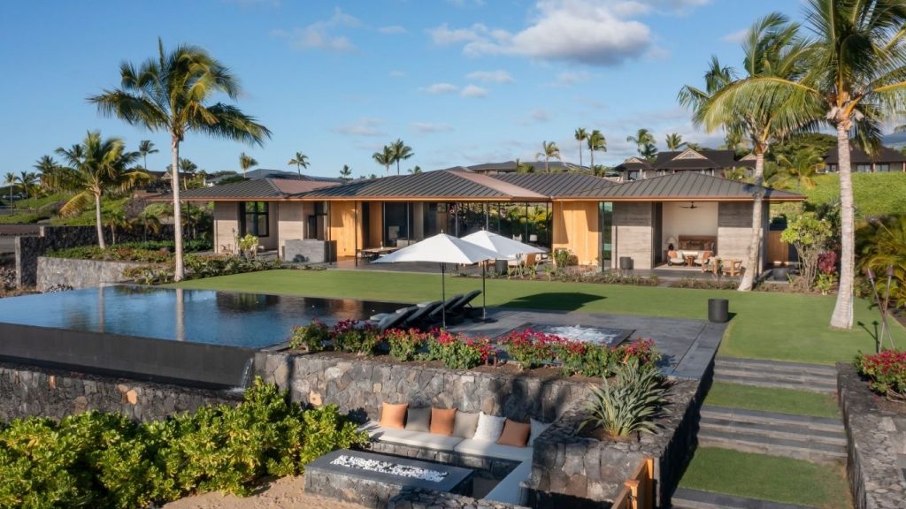 Outside, a private sanctuary unfolds to an infinity-edge pool and spa overlooking the Pacific, complemented by covered dining and lounge spaces for gathering. A fire pit made for slow Kona sunsets and ocean breezes completes the outdoor experience, offering a tranquil setting for relaxation and entertaining.