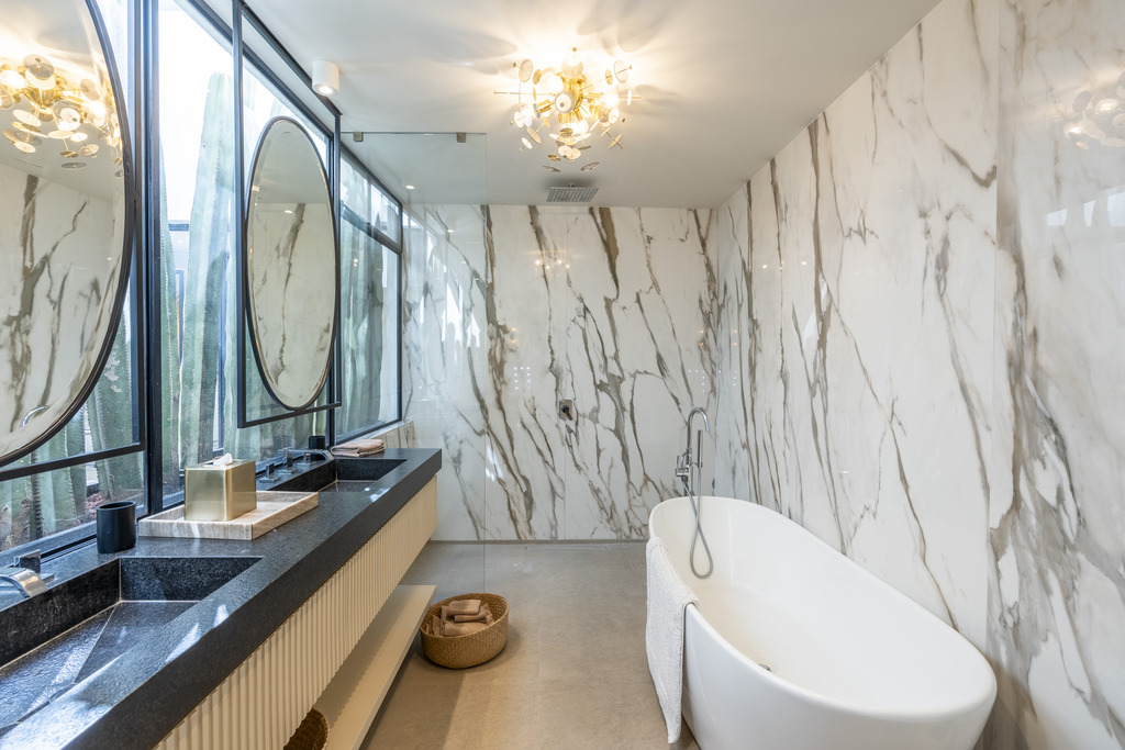 Master Suite Serenity: The master suite is a haven of comfort and style. A tailored walk-in closet provides ample space for your wardrobe, and the bedroom is graced by a marble fireplace. A separate dressing room leads to an exquisite bathroom featuring floor-to-ceiling marble walls, a freestanding soaking bathtub, and sleek, honed black marble counters. Every piece of cabinetry in the master bathroom is meticulously crafted, adding a touch of individuality.