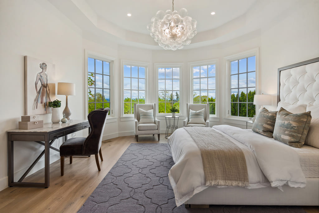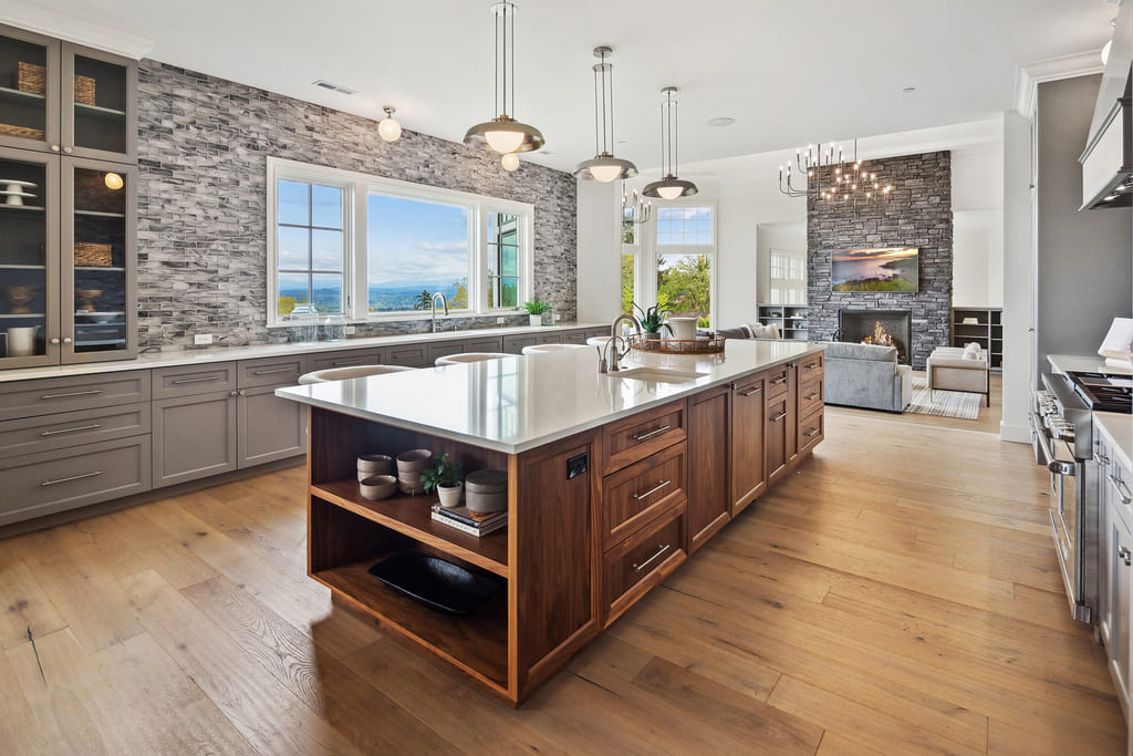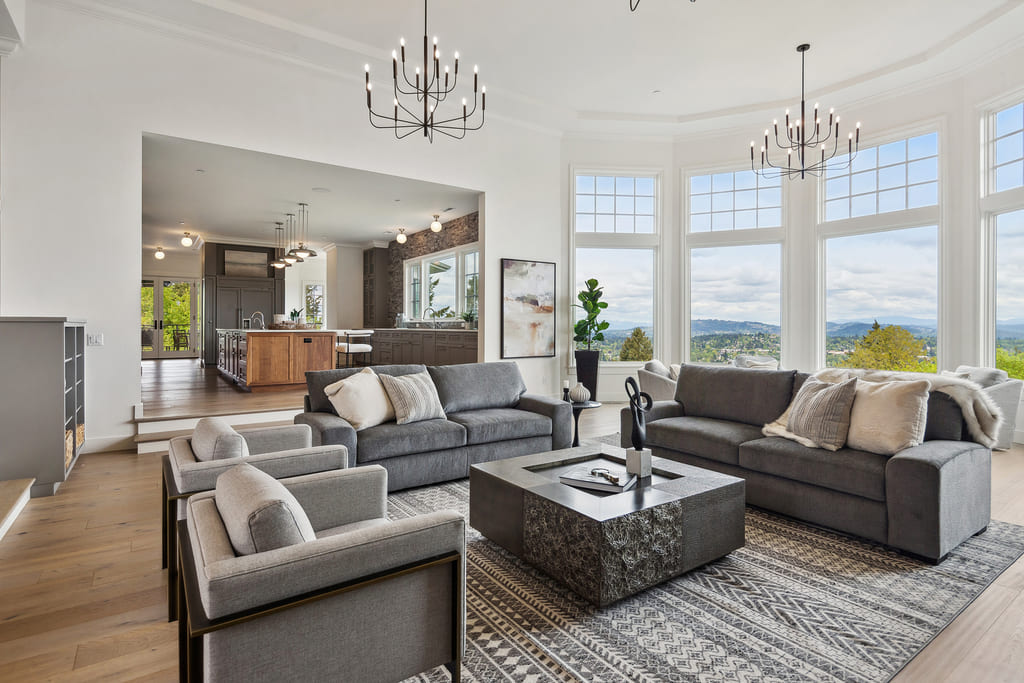 The sweeping front drive spans the broad expanse of the home, where crisp, white, board-and-batten siding coupled with cultured stone sets the stage. Step inside the custom Marvin double front doors to take in the awe-inspiring panoramic view from the living room’s window walls. Light-toned British Oak hardwoods extend throughout the open floorplan, perfectly designed for entertaining on large and intimate scales and effortlessly elegant everyday life. The living room’s soaring ceiling-height stone fireplace surround, anchored on both sides by built-in bookcases, draws attention to the 14-foot ceilings of this show-stopping space. Three classically minimalist, multi-tiered chandeliers gracefully illuminate the room. Throughout the home, white walls with thick base and crown molding complement French grey accents, including doors, wainscoting, and built-in bookshelves. The view is truly the star of the show, stretching as far as the eye can see.