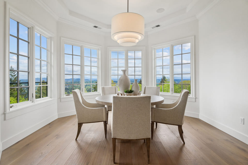 The gourmet kitchen is centered around a large central island topped in creamy quartz with ample space for seating. This kitchen has a place for everything in the gorgeous custom cabinetry designed with clever and abundant storage and organization features, including double pantry pullouts flanking the refrigerator and multiple trash/recycling pullouts. Top-of-the-line appliances include a six-burner plus griddle Wolf range with dual ovens and a convenient pot filler, a cabinet-front Sub-Zero refrigerator, two Miele dishwashers, and a built-in coffee station. The mosaic tile ceiling-height backsplash adds texture and movement to this sleek and welcoming space. The adjacent sunny breakfast nook is the perfect spot for coffee, with a view framed by four sets of windows. A contemporary tiered drum pendant adds elegance and a soft glow to the cozy space.