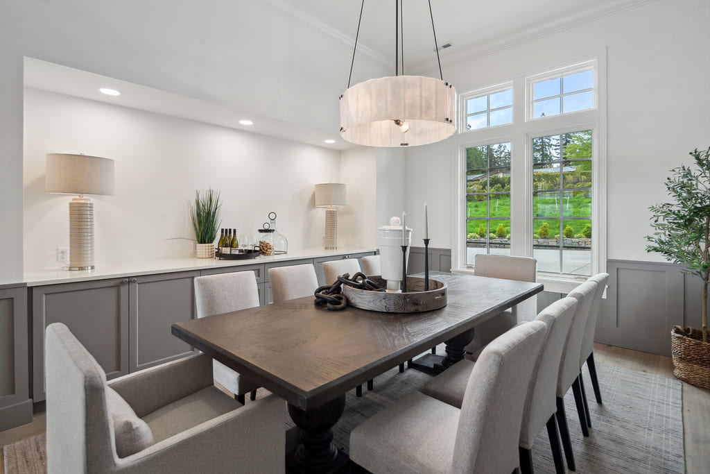 The formal dining room overlooks the front of the property with a beautifully elevated design, including a Willamette Pearl White Fluted Chandelier from Rejuvenation, classic wainscoting, and a sleek built-in buffet with a quartz top. The nearby custom butler’s pantry was newly designed and crafted by skilled carpenters with Ashely Kiely Living and includes custom-built adjustable shelves, quartz countertops, and wall organization from Pottery Barn. Kiely, an organizer and general contractor, also worked closely with the homeowner to customize closets throughout the home, including bedrooms and an additional pantry just off the kitchen.