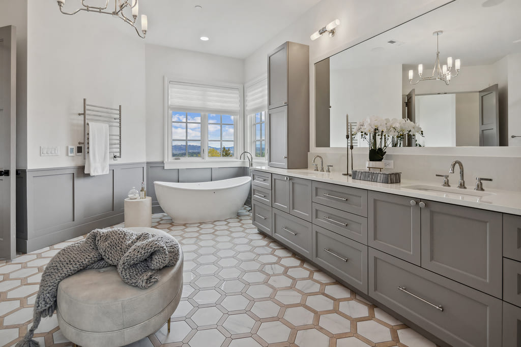 With a layout designed for main-floor living, the serene primary suite includes an attached, light-filled office that could also be used as a sitting room, yoga studio, or nursery with an attached full bath. The spacious bedroom features five double-height bow windows framing the spectacular mountain view. The inviting gas fireplace is crowned with a crisp, classic mantle, and a modern Visual Comfort Kelly Wearstler Rousseau Chandelier hangs above. The ensuite bath makes every day a spa experience with heated Honeycomb Bianco Veneto Dolomite + Karya Royal Honed and Polished tile floors and classically elegant French grey wainscoting. The oversized frameless glass walk-in shower has multiple heads, including a rain shower, a bench, and two shower niches with a heated towel rack in arm’s reach. A decadent, freestanding MTI soaking tub sits in a sunlit corner. The dual walk-in closets are incredibly spacious and include custom storage options. A second main-floor bedroom with a stylish ensuite bath is nearby.