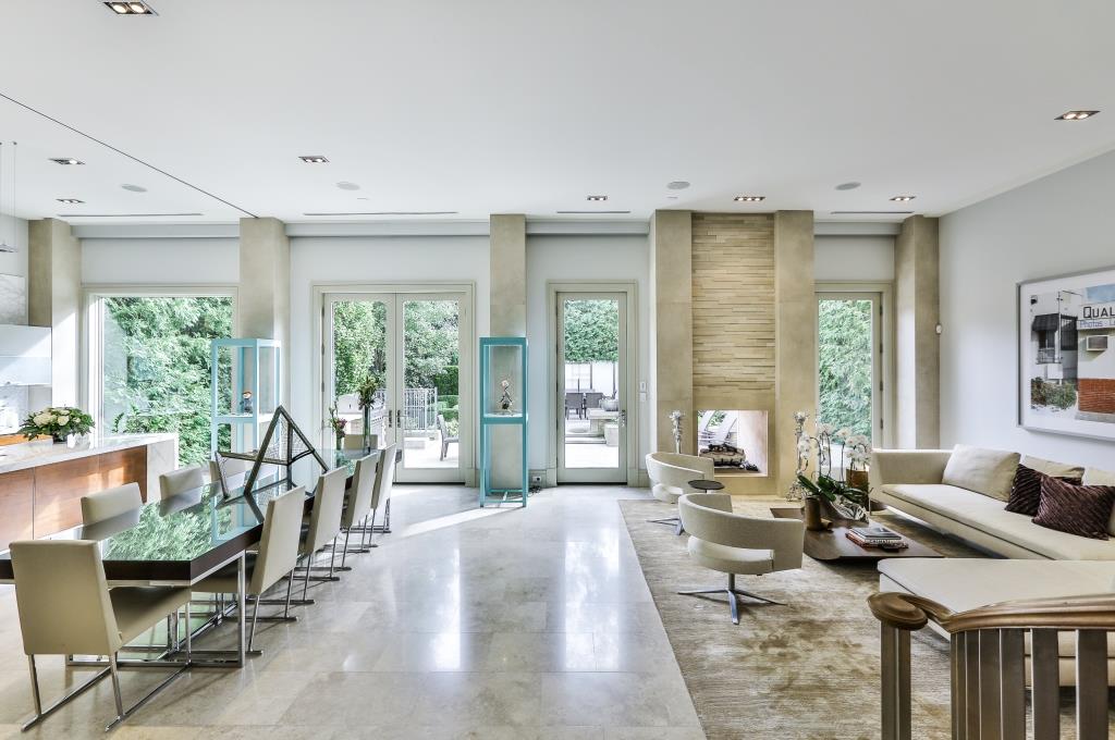 The foyer invites a warm welcome enhanced by Jerusalem Grey limestone floors and floor-to-ceiling enclosed frosted glass closet. Painted walls in muted tones and soft mood lighting provide the perfect backdrop for showcasing artwork. Grand entertaining may be enjoyed in the living room/dining room combination. A double-sided gas fireplace, French doors opening to gardens, expansive windows and 12-feet soaring ceilings create an ambiance of spacious flow. Retractable frosted glass screen panels separate the formal dining area from the epicurean kitchen fully appointed with top-of-the-line appliances.