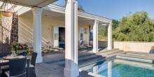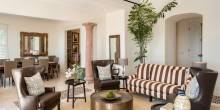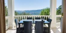 The villa consists of four structures: the main residence, two guest houses, and a stone garage. Access is via gated entry to a paved driveway with gravel circular drive and plentiful paved and unpaved parking areas. The award-winning, three-bedroom, two-and-a-half-bath main residence has heated stone floors and is air-conditioned. The exterior entry features multiple columns with a gentle staircase and vintage French entry doors. The foyer opens to the living room with a splendid 22-foot square rotunda, exquisite, hand-carved stone fireplace mantle, and multiple banks of tall French doors with terrace access. The formal dining room is flanked by cast stone columns with double pocket doors that open to a library/media room. The open kitchen has stainless steel countertops, a breakfast bar, and access to the terrace. The curved rear terrace is accessed from multiple tall sets of French doors.