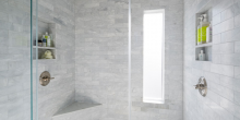 The upper level is a full-floor master suite with a fireplace, a sizable terrace, and Alcatraz views. An exquisite master bathroom offers an Artic White Marble dual-sink vanity and a dual-head shower with seating. On the first level, the guest en suite shares a terrace with the third bedroom, which has been reimagined as a cozy media room with built-in cabinetry.
