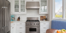 Enjoy the appeal of the 10-foot ceilings, warm-hued oak hardwood floors, and an attractive layering of rich textures complemented by a serene palette. Double French doors lead to lovely terraces extending the living space to the outdoors. The numerous windows and doors bring in natural light that warm the interior spaces, and an open floor plan on the main level allows for seamless entertaining. The living room features a fireplace with a stone surround and a panel to attach artwork that automatically conceals the flat screen television with the push of a button. Elegantly dine in the formal dining room or enjoy casual meals at the marble kitchen counter. The beautifully remodeled kitchen offers a built-in banquette with storage, striking Calacatta counters, and custom cabinetry accented with white subway tiles.