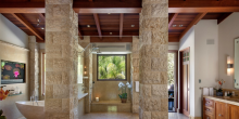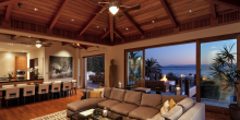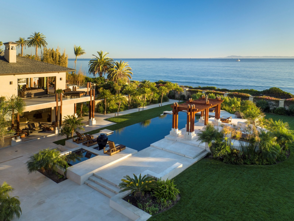 This one-of-a-kind ocean view contemporary built in 2008 captures the essence of Balinese charm with bold modern architecture; stunning Pacific Ocean, Channel Island, and Butterfly Beach views; extensive indoor-outdoor living areas; expansive rooms; and plantation-style ceilings. The main home is approximately 5,198 square feet with four bedrooms and five-and-a-half bathrooms. Located on Channel Drive on approximately 1.13 acres, this rare trophy property features an inverted floor plan positioning the main living areas on the highest floor to maximize the long, unobstructed ocean, island, and harbor views and prevailing ocean breezes from this elevated perspective, while creating dramatic vaulted living areas, including the grand living room open to the dining area and gourmet kitchen with breakfast alcove. Massive floor-to-ceiling, disappearing sliding-glass doors expand the living area creating a seamless transition to a large wrap-around limestone entertainment deck complete with an outdoor kitchen and fire pit. The treasured view is also seen from the upstairs master bedroom suite complete with a luxurious master bathroom and access to a private outdoor terrace. The first level is centered on a large family room foyer with a fireplace that takes advantage of massive floor-to-ceiling sliding-glass doors that open to a covered loggia and second entertainment patio with a large outdoor gourmet kitchen and a view of the luxurious and oversized pool and spa with limestone patio and covered loggia. The family room foyer has a full-bathroom and two built-in hidden bunk beds. Three large guest suites with custom en suite bathrooms are located on the first level and in the attached guest house that has a full kitchen, a living room with a fireplace, and a separate bedroom with a full bathroom. There’s also a pool cabana with a fireplace, a wet bar, and a full bathroom. Across the lawn area is a gym with a half bathroom. The property is surrounded by a tall stucco wall with a gated pedestrian entrance and includes an accessible three-car garage. This luxury home comes furnished. Suzanne Perkins is the listing agent for this property.
