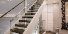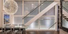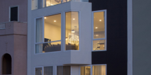 At the front of the home, diagonally-angled, large walls of glass direct the eye toward exceptional downtown San Francisco views that are spectacular day or night. On the south-facing rear side, eco-consciousness is exemplified by a wall of industrial polycarbonate panels, which filter heat for energy efficiency, allow for abundant natural light, and also obscure the guesthouse across the rear courtyard. Maximizing the views on the city side of the home, the interior open-tread stairs spanning three levels were placed in front of these modern panels. Nine- to 10-foot ceiling heights enhance the open concept floor plan.