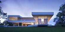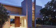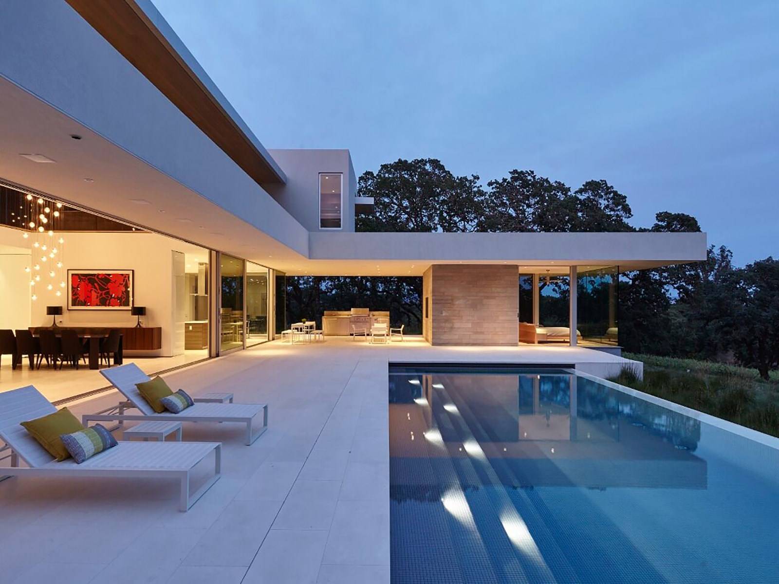Mature oaks and breathtaking wine country views create a stunning backdrop. The estate is approximately 5,000 square feet, with three-bedroom, two-and-a-half-bath main residence built of glass, stucco, and stone. There is a cantilevered guest house that appears to float above the land and an approximate 810-square-foot “barn” modeled after the main home. The steel framed residence was constructed over a period of four years and was designed by Robert Swatt of Swatt Miers Architects. The easy care landscaping was designed by Bernard Trainor.