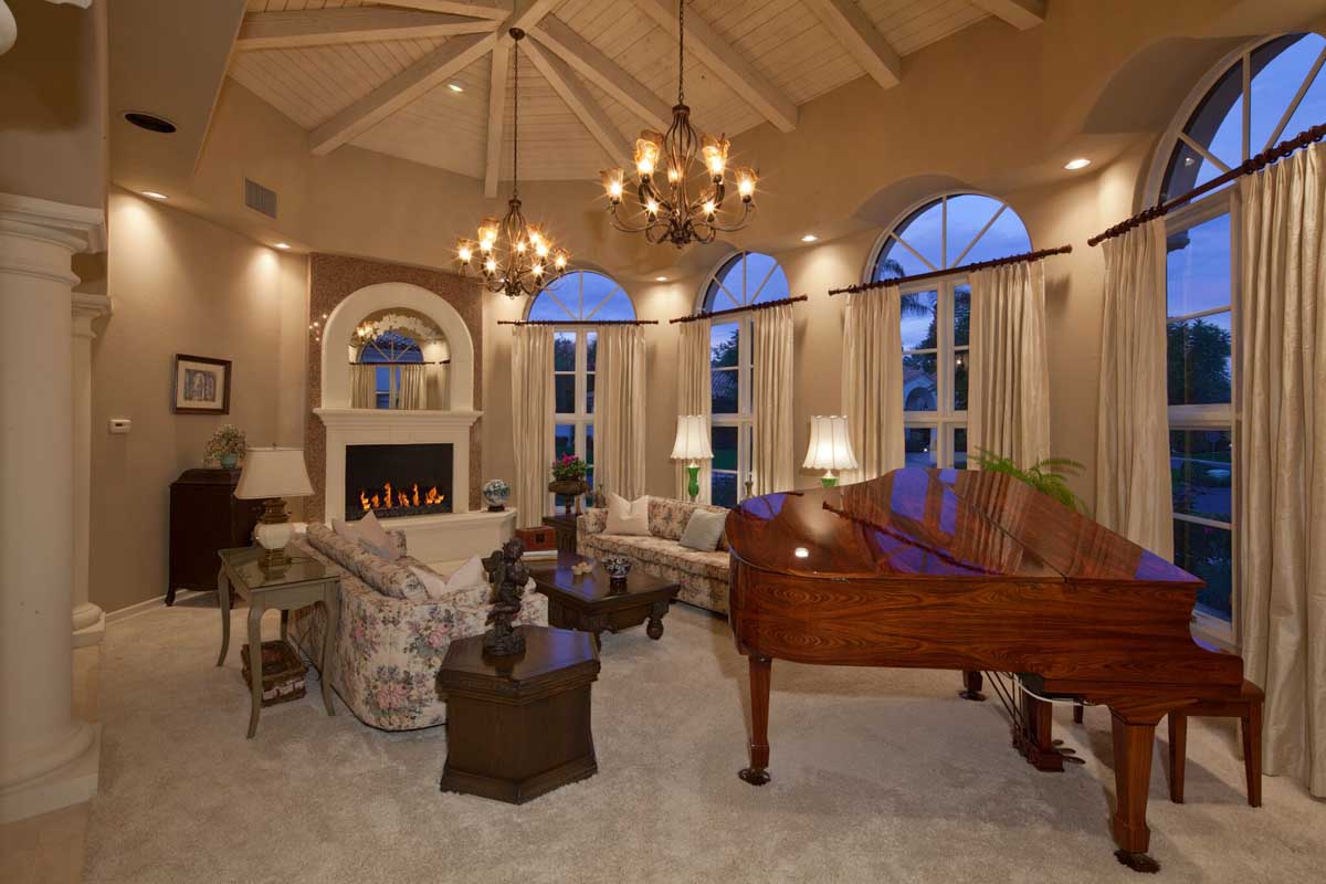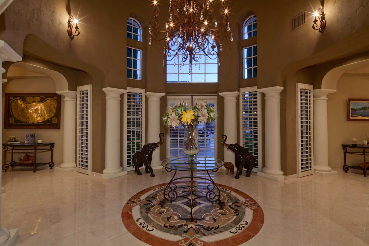 The grand entry hall leads to the living room with a fireplace and beamed ceilings.
