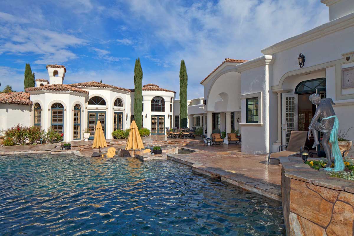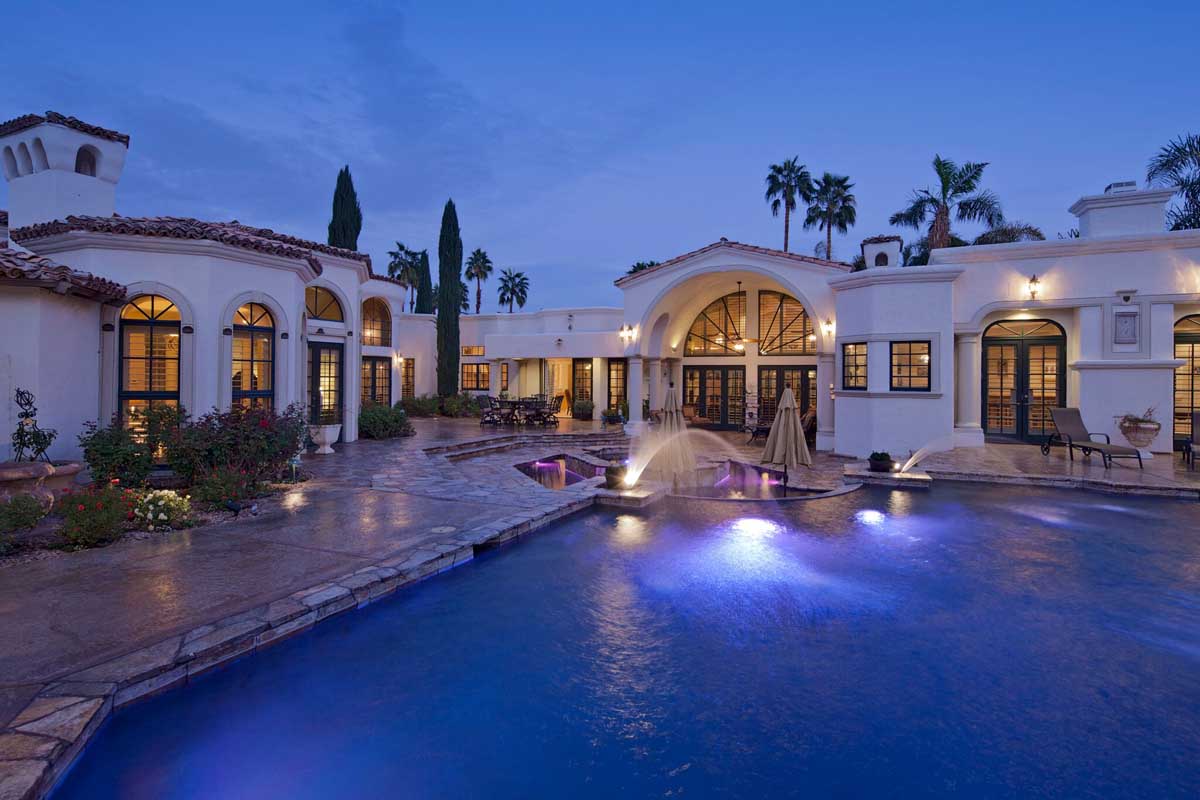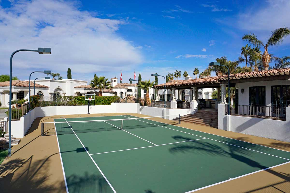 The resort waterfall pool has an oversized spa with fountains next to the home gym and a sunken and lighted tennis court.