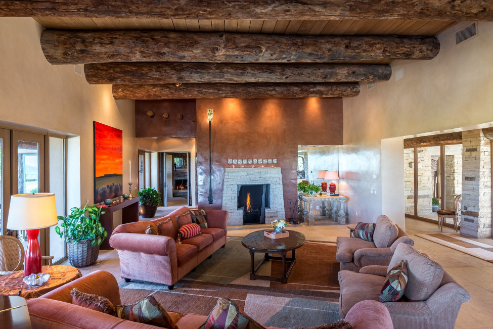 The slightly sunken kiva-style dining room’s highlights include massive viga posts from Colorado and a stacked viga ceiling.
