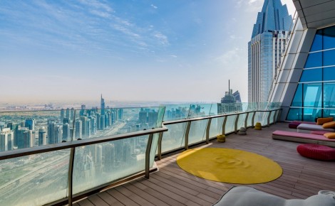 Occupying the top three floors of the 90-story Marina 23 tower, this penthouse has an octagonal shape and is framed