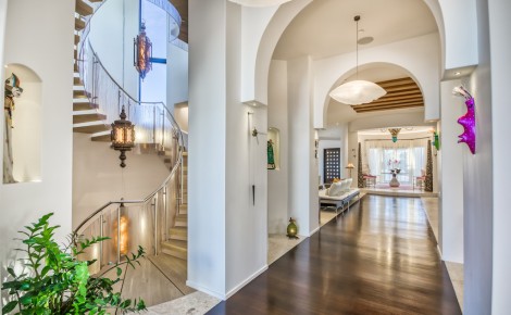 This home offers an additional garden lot w/ palm trees, cabana & professionally designed landscaping & lighting