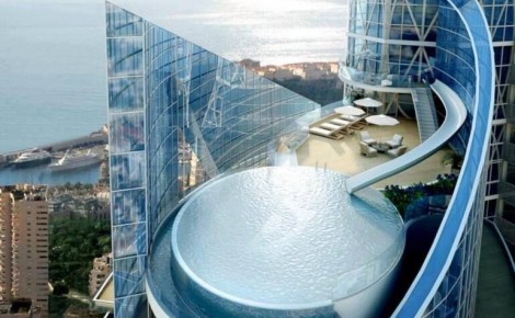 The Odéon Tower in Monaco has a rooftop, infinity pool with a water slide that creates fairytale living at its