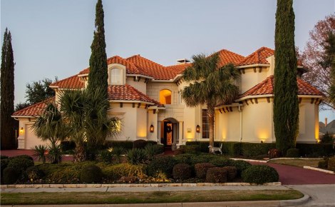 Stunning lakeside Mediterranean estate in the exclusive gated community, The Lakes on Legacy Drive. The grand, two-story entrance features marble
