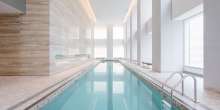 For those looking for some fun, the building features a billiards room and a large library curated by world-renowned publisher Assouline. Elsewhere, a comfy 18-seat screening room boasts top-of-the-line projection equipment and a 220-inch screen, delivering a true cinematic experience in residence. Also present among the amenities is an executive boardroom and a 75-foot, two-lane indoor swimming pool and separate Jacuzzi. A labyrinth of spas, saunas, and massage-therapy rooms sit nearby. Managed by The Wright Fit, the massage rooms offer Swedish, deep-tissue, sports, pre/postnatal, shiatsu, and Thai techniques.